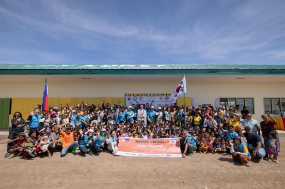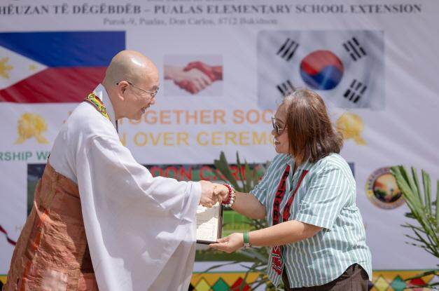 After the performance, Venerable Pomnyun Sunim, Chairperson of JTS, presented the completion certificate to the municipal mayor. JTS representative Park Ji-na handed the school keys to the Bukidnon Provincial Education Director, and Roh Jae-guk presented a clock to the school principal.